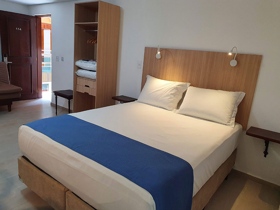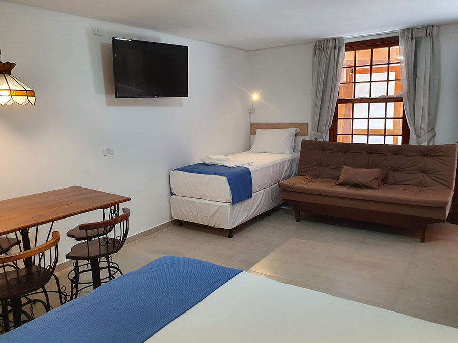 Oferece apartamento tipo estúdio com inúmero diferenciais, entre eles: ar condicionado Daikin Q e F 12.000 BTU's, TV 43" com canais abertos, Netflix, YouTube, Internet de alta velocidade, maquina de café expresso com blends importados (vendidos separadamente), microondas, sanduicheira, liquidificador, frigobar, copa completa, colchão de 33cm, água quente e fria no banheiro e cozinha, cortina black-out.
